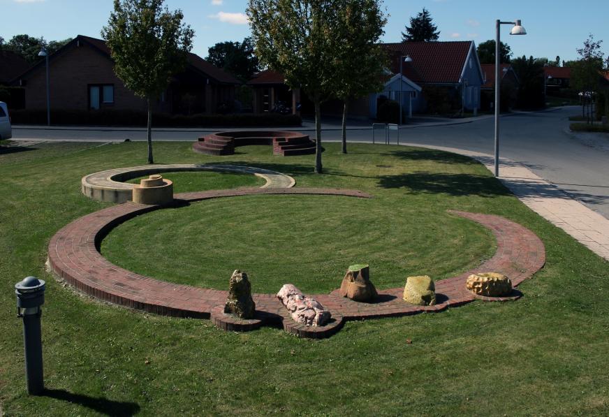 På Jægerstien i Østerhøj ligger der et lille villakvarter på kanten af naturen. Hvert hus har sin egen have, men centralt i bebyggelsen findes også et fælles sted: En lille græsplæne med nogle træer og tre cirkelformede skulpturer i tegl og keramik. Tilsammen danner de et lille fantasiskabende landskab, hvor børn og voksne kan lege og mødes.